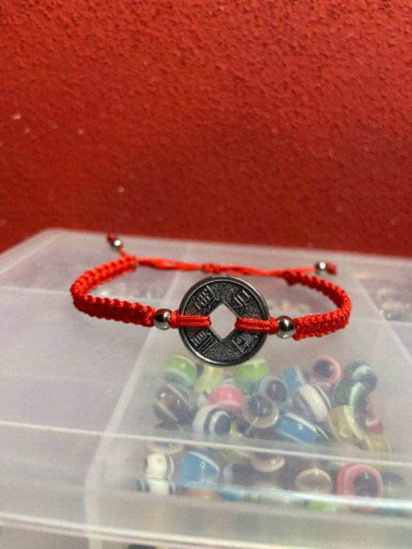 Cuenta con la famosa moneda china que desde la antigüedad ha sido considerada para traer suerte, riqueza y buena fortuna en un cordón trenzado rojo para la buena suerte y protección de males.