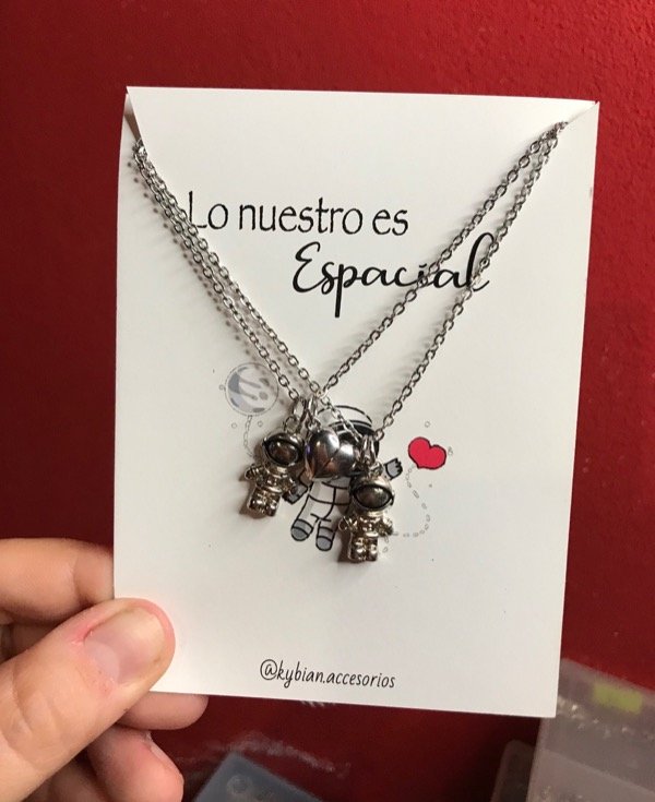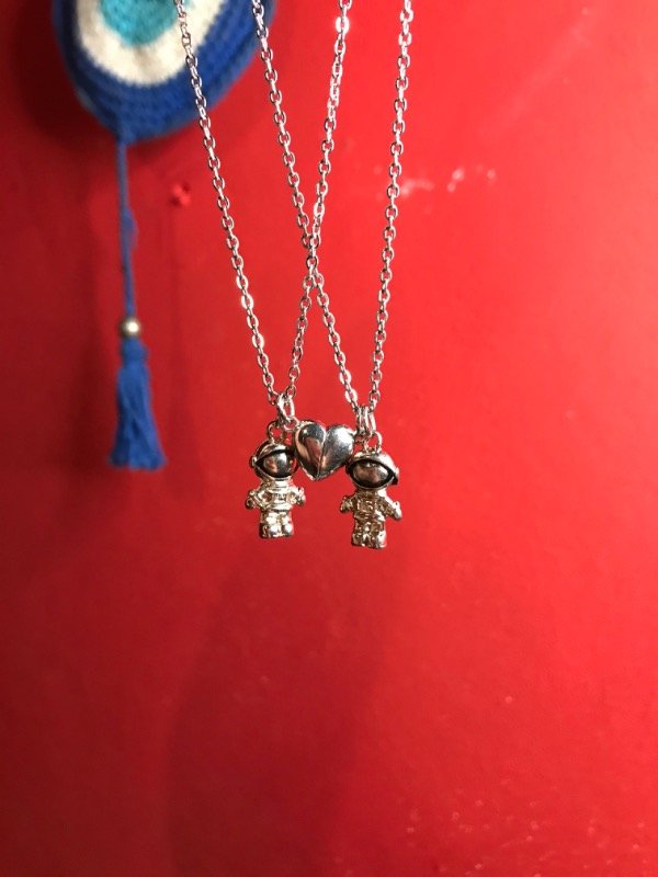 Par de collares de acero quirúrgico, dije de iman y dijes niquel de astronautas.
